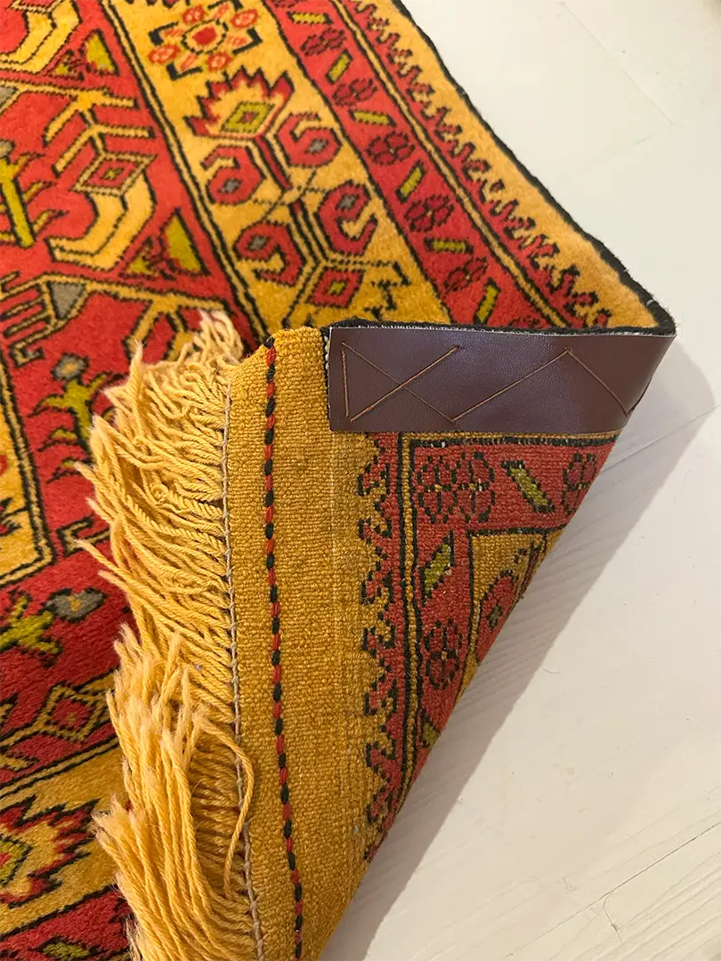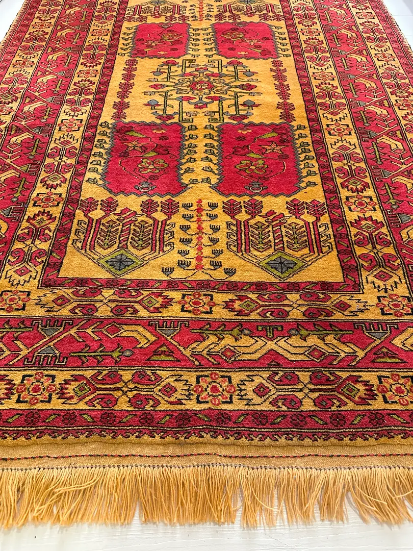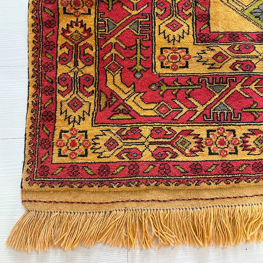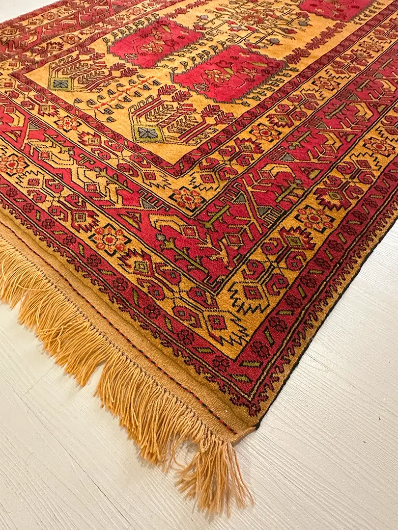 The color palette, dominated by deep reds, ochres, and golds, brings a warm presence to any room while highlighting the authentic and timeless character of this traditional carpet.